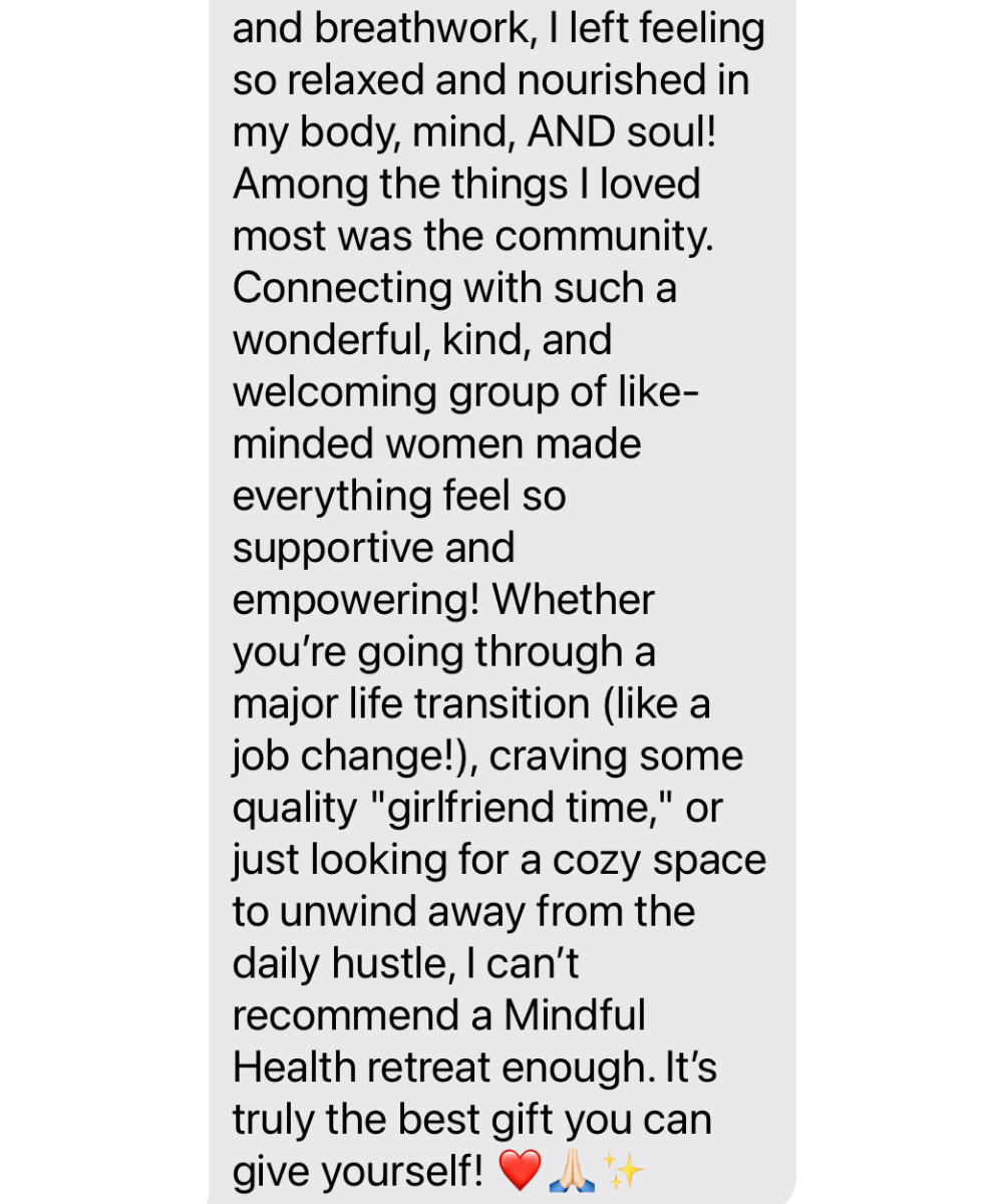 The blend of mindfulness practices, gentle movement, and shared community felt deeply grounding and nourishing. The food was incredible - wholesome, thoughtfully prepared, and full of flavor, clearly made with care and intention.